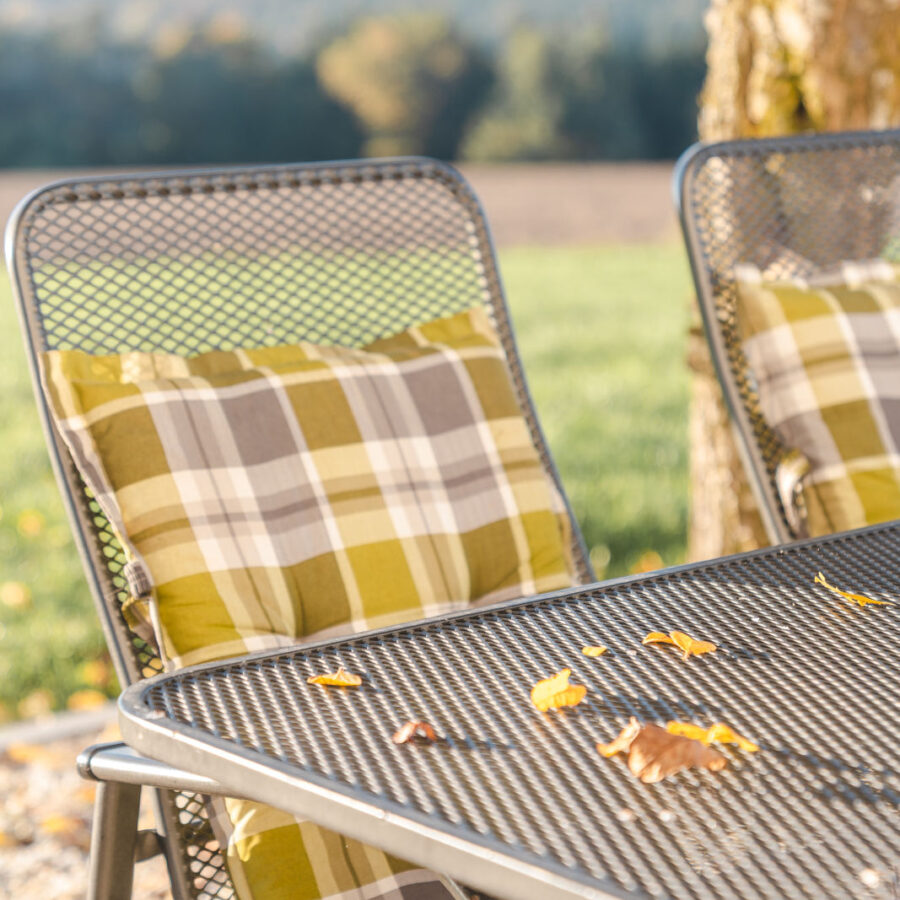 Im Gartenhaus befindet sich eine Terrasse mit gemütlichen Gartenmöbeln.